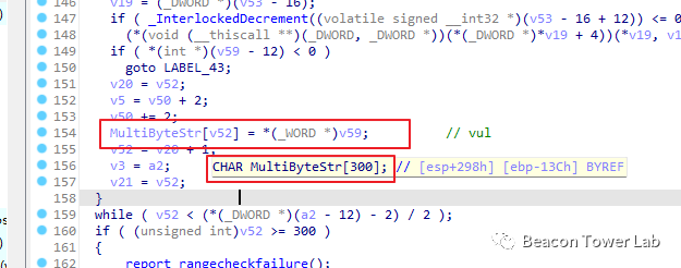 在反编译工具IDA中可以看到漏洞产生处的伪指令为 MultiByteStr[v52] = *(_WORD *)v59,此时缓冲区的大小为300个字节,长度太小导致了溢出,覆盖了栈中函数返回地址和正常变量值,导致后续指令执行错误,使程序崩溃,如下图所示: