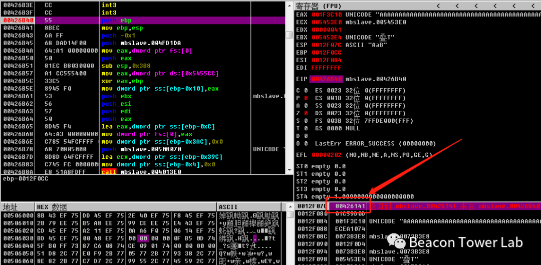 为更方便和直观,使用调试器OD重新调试程序mbslave.exe,在异常发生地址所在函数0x426B40下断点,再次将poc内容复制到注册对话框中,触发漏洞,调试OD将停止在断点处,此时,栈中的函数返回地址为正常值0x426141,如下图所示: