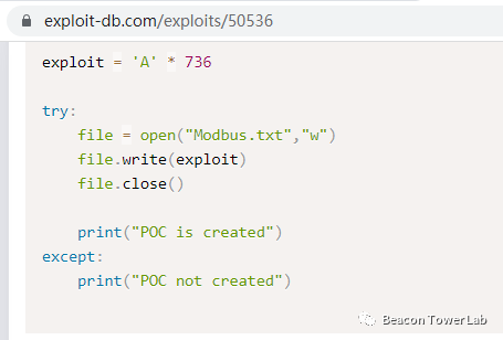 根据exploit-db上已公开的poc.py生成Modbus.txt,Poc比较简单,Modbus.txt的内容为736个字符“A”,如下图所示: