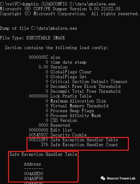 除此之外,溢出还覆盖了栈中结构化溢出处理(SEH)函数地址,当异常发生时,将跳转到异常处理函数执行代码,但是该程序中开启了Safe SEH安全保护机制,简单来讲,不是预定义的异常处理函数地址,不予执行,使用 dumpbin /loadconfig mbslave.exe命令可以查看Safe SEH 表,如下图所示: