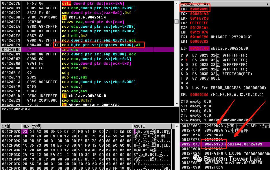 根据上图,可以看出,正是地址0x426DF9处的汇编代码,将EAX最低字节AL的值0x93覆盖栈中的函数返回地址的最低字节,说明导致栈溢出的代码就是该条汇编代码,当前除了覆盖栈中返回地址,栈溢出还覆盖了栈中结构化异常处理地址(SEH)等内容。