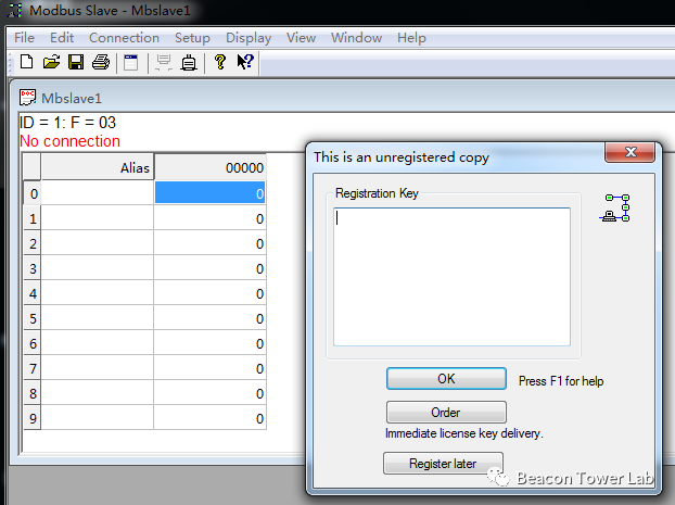 首先安装modbusslavesetup32bit_7.1.2.1357.exe程序,默认安装后主程序路径为C:Program FilesModbus ToolsModbus Slavembslave.exe。