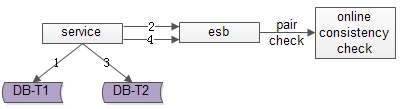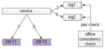 (2)数据仍可能不一致,例如第二步写入T1完成后服务重启,则数据不会写入T2
