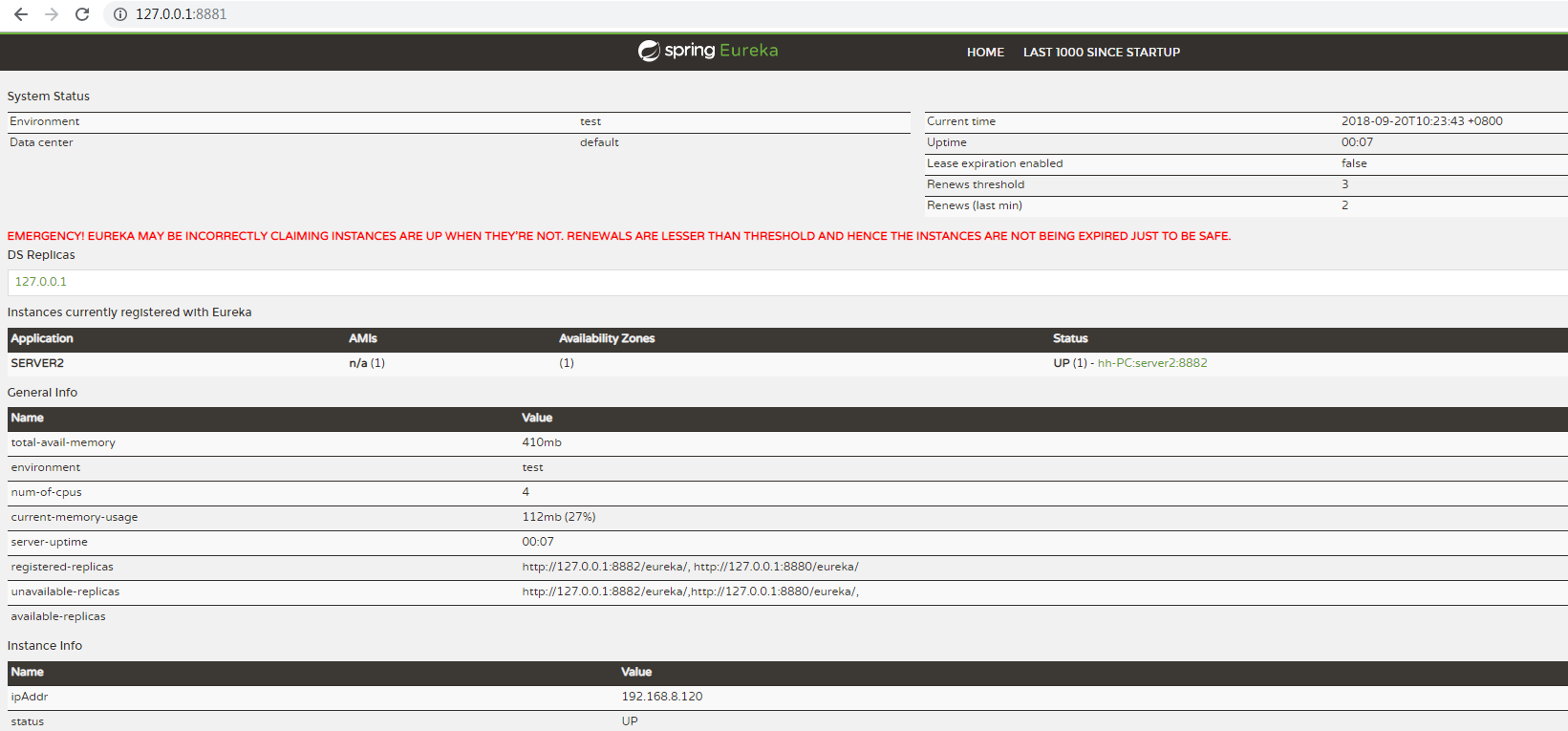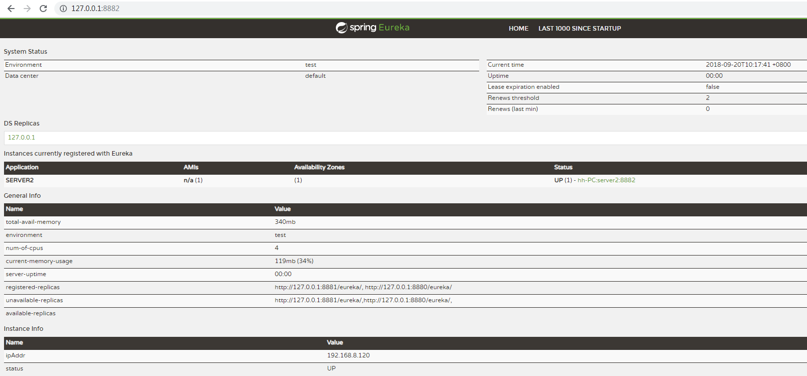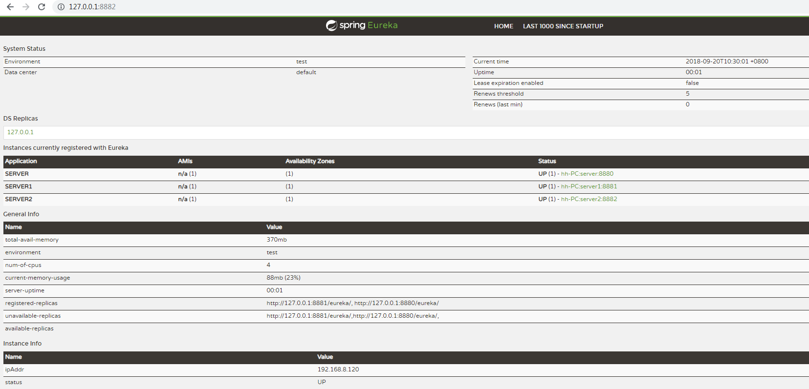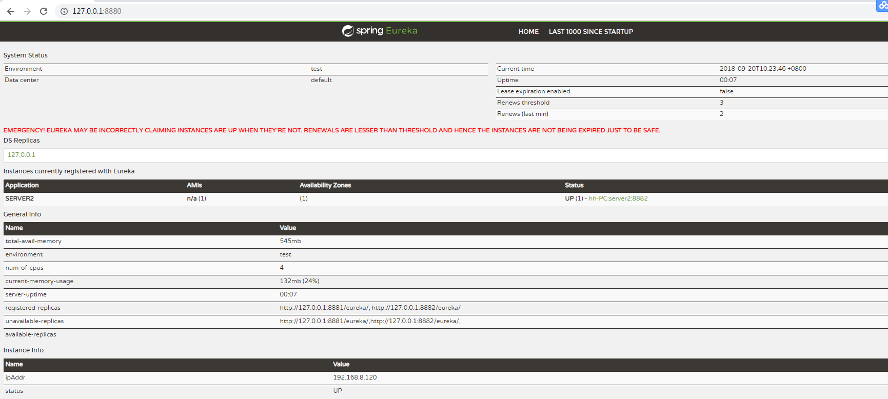 此时验证高可用性,我们停掉其中的1~2台服务,再次访问,仍然OK,说明高可用配置的成功,接下来我们把client的yml文件注册地址只保留一个8880,再次测试,发现只注册一个三个都会同步,当宕掉8880和其他任意一个,仍然可以成功调用接口,可见其高可用性能得到了较好保证。