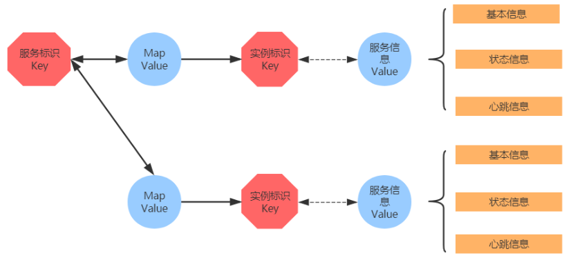 Eureka的注册表是一个双字典结构的数据,服务发现的目的是标识服务和服务状态的管理,所以注册表中有服务标识、服务基本信息、服务状态信息等