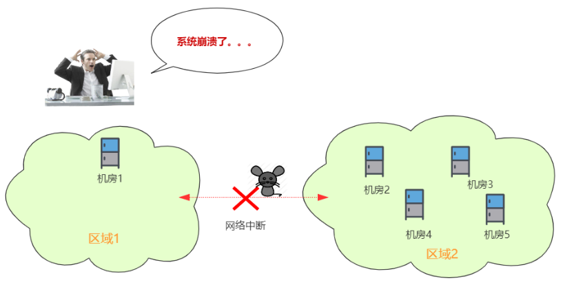 有一个大型的分布式系统,所有的实例节点部署在网络互通的5个机房内,节点各自完成工作,就这样安静的工作,有一天夜里,有一只饥饿的老鼠咬断了A机房与外界通信的光缆。