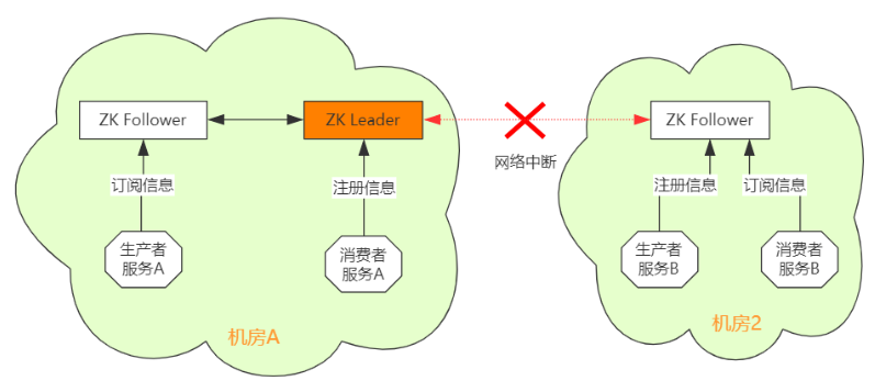 例如现在有两个机房,机房A中有一个主节点和一个从节点,机房B有一个从节点,当出现某些原因,两个机房无法进行通信,那么当机房2中生产者服务B进行服务注册时,从节点要同步到机房A中的主节点才算注册成功,由于zk CP使用的是强一致性,所以会注册失败。在机房2中生产者与消费者直接进行调用是没有问题的,但是zk为了一致性,牺牲了机房2中的部分可用性。