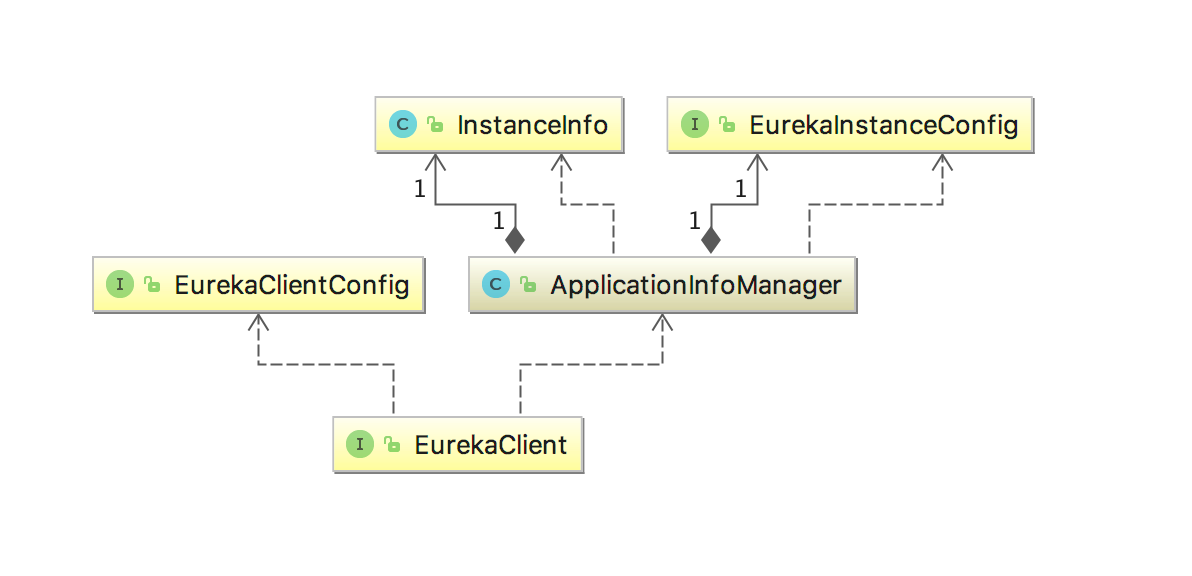 该类管理了服务实例的信息类InstanceInfo,其内包括Eureka Server上的注册表所需要的信息,代表了每个Eureka Client提交到注册中心的数据,用以供服务发现。同时管理了实例的配置信息EurekaInstanceConfig,SpringCloud提供了一个EurekaInstanceConfigBean的配置类进行默认配置,也可以在配置文件application.yml中通过eureka.instance+属性名进行自定义配置。