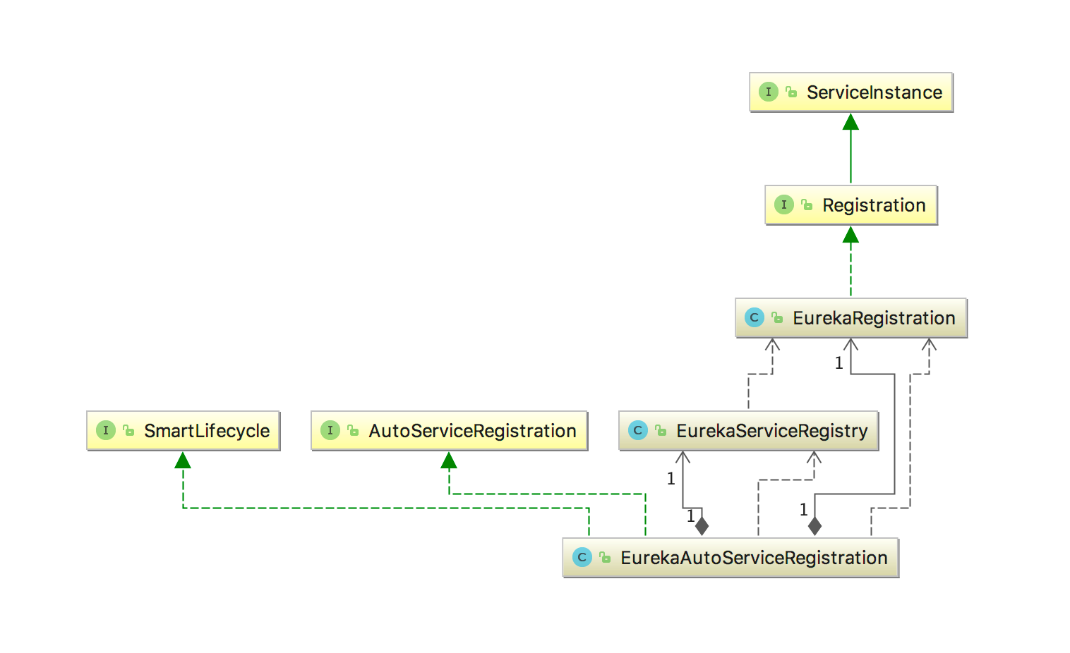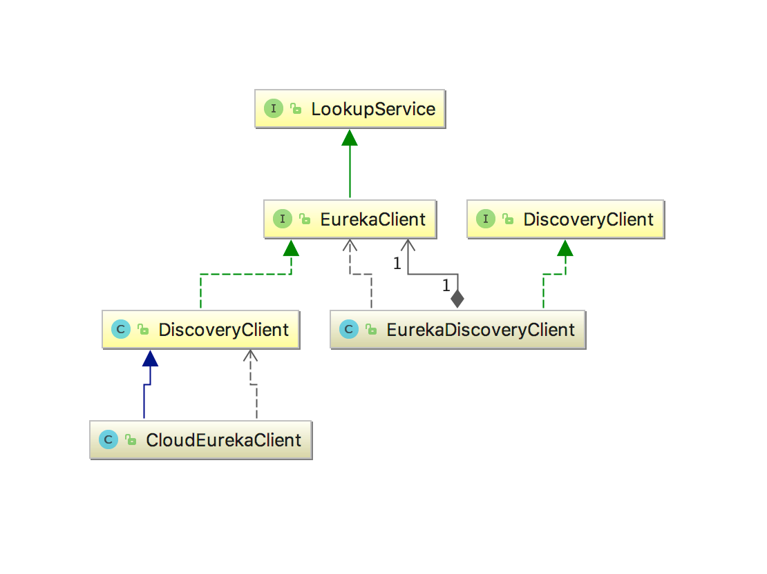 EurekaClient来自于com.netflix.discovery包中,其默认实现为com.netflix.discovery.DiscoveryClient,这属于eureka-client的源代码,它提供了Eureka Client注册到Server上、续租,下线以及获取Server中注册表信息等诸多关键功能。SpringCloud通过组合方式调用了Eureka中的的服务发现方法,关于EurekaClient的详细代码分析将放在客户端核心代码中介绍。为了适配spring-cloud,spring提供了一个CloudEurekaClient继承了com.netflix.discovery.DiscoveryClient,同时覆盖了onCacheRefreshed防止在spring-boot还没初始化时调用该接口出现NullPointException。