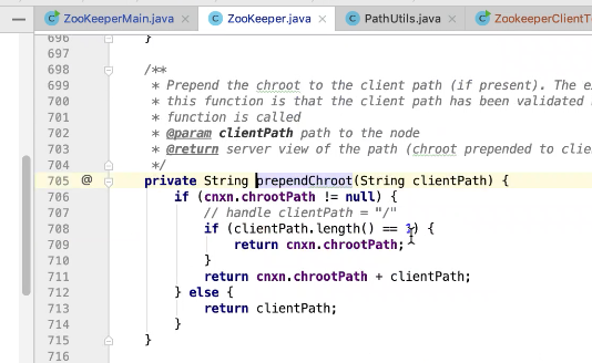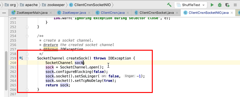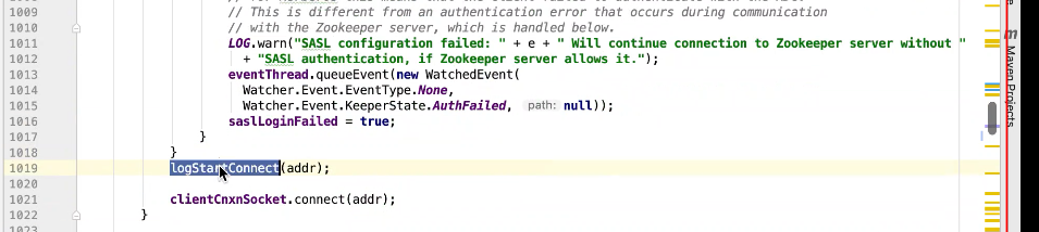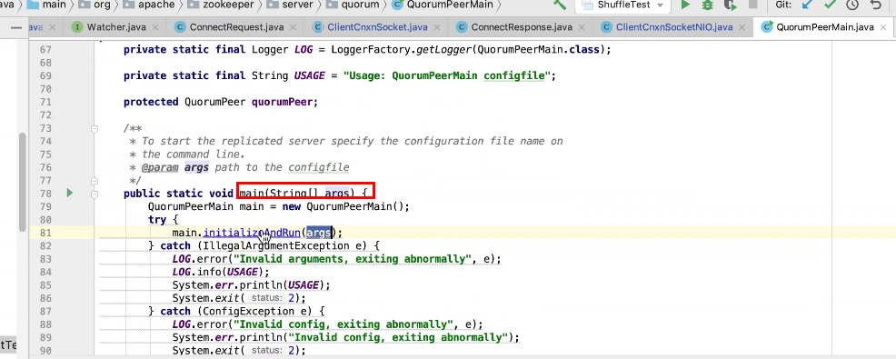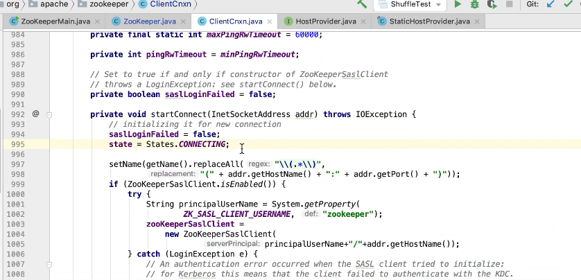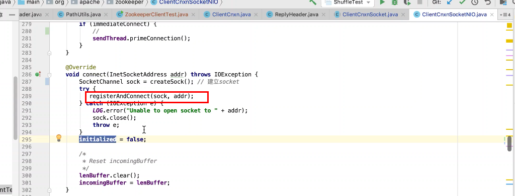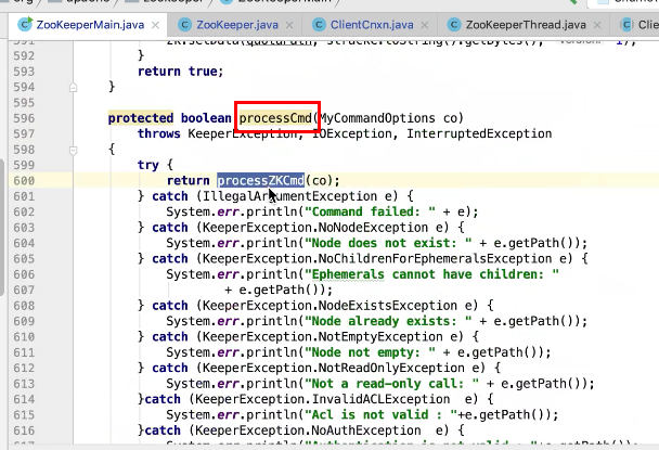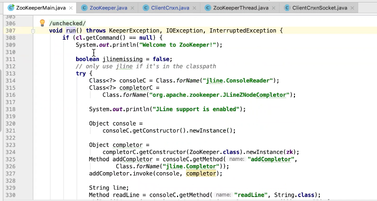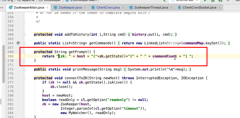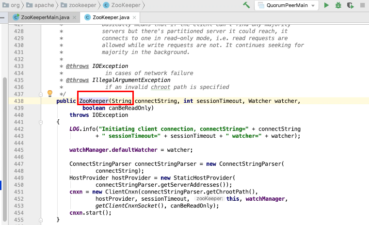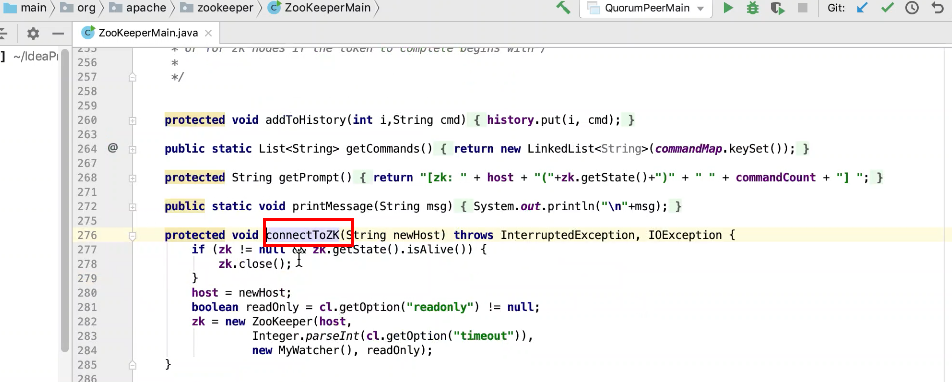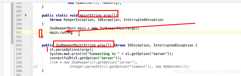 图2 290行 new ZookeeperMain , 297行连接zk