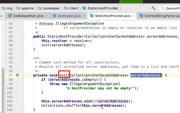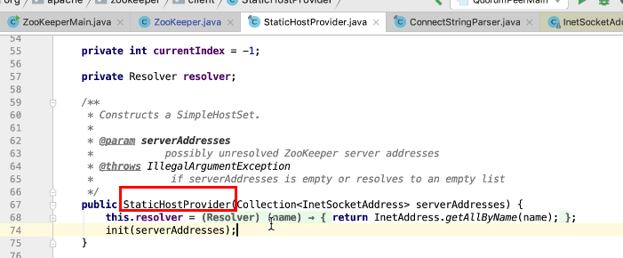 图6 图7 图8 意思是 传进来的地址 以逗号截取,然后每一个地址再以":" 分号截取,封装到inetSocketAddressHolder类中,然后把 inetSocketAddressHolder 放在一个ArrayList中serverAddresses中。