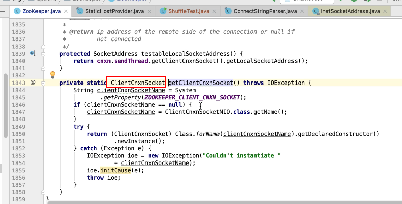 图11 图12 1884行先拿 图12 的key 去配置文件中查找是否配置这个名字,如果没有配置ClientCnxSockNIO 的全类名,然后反射实例化返回。