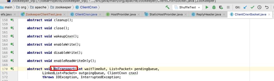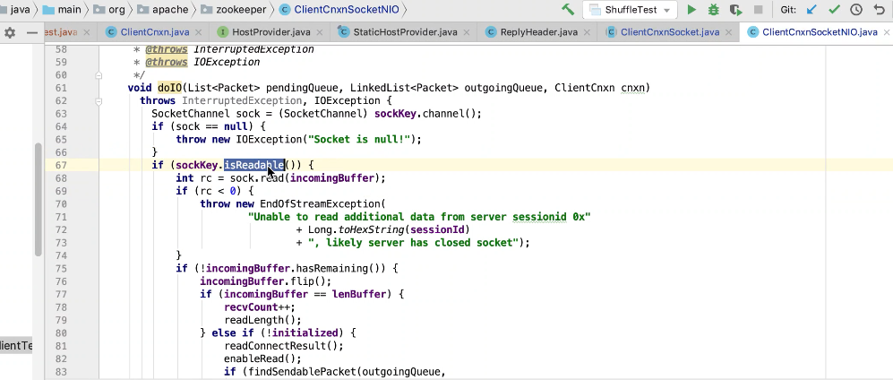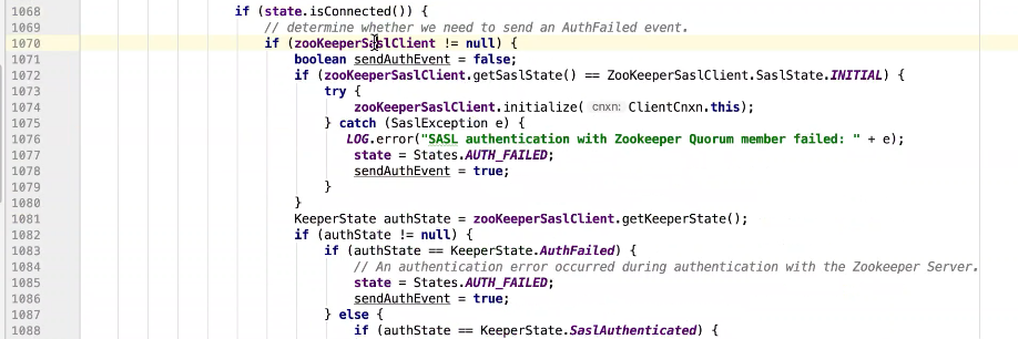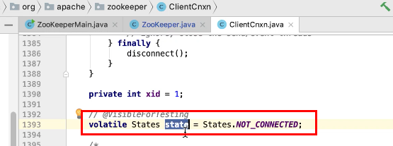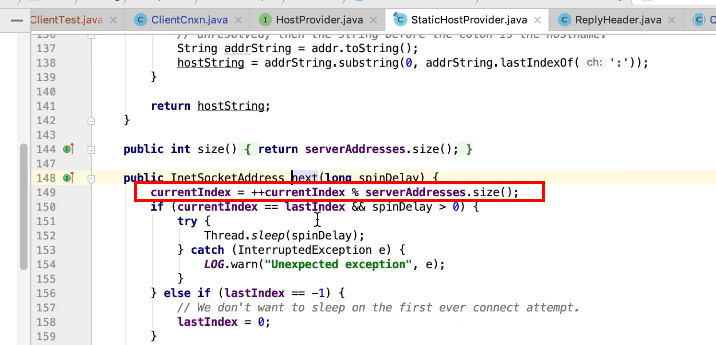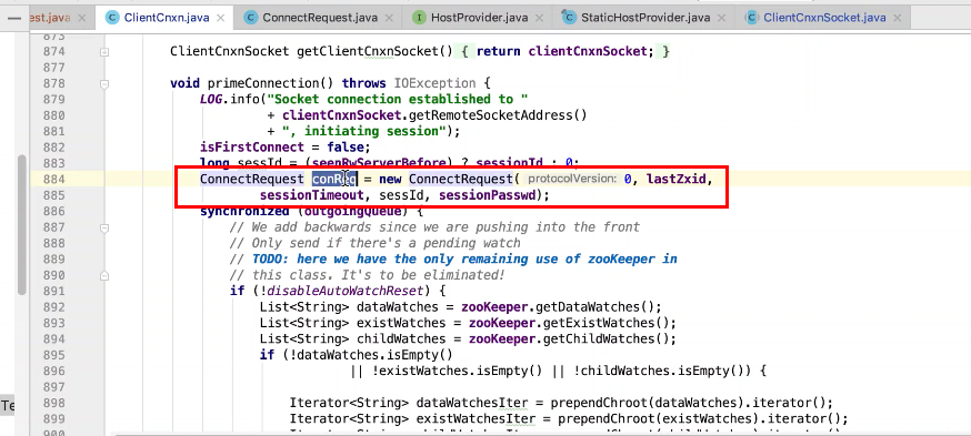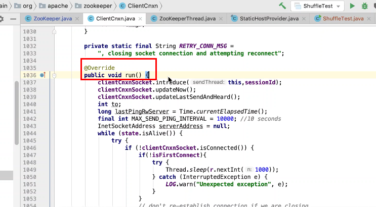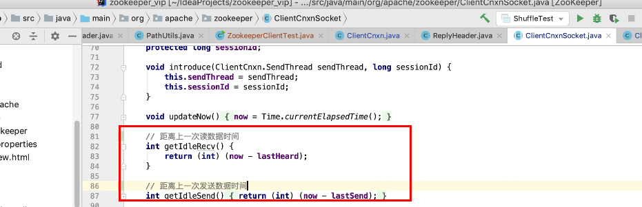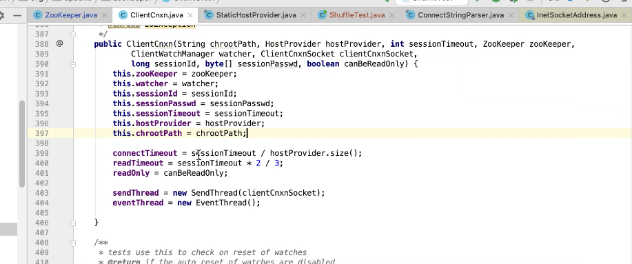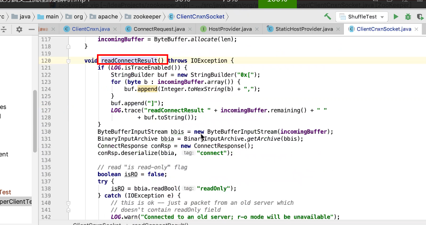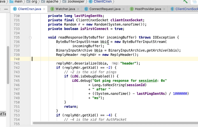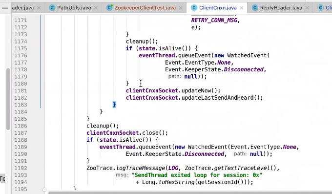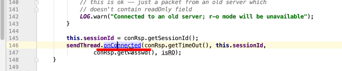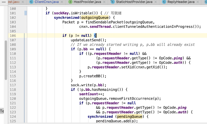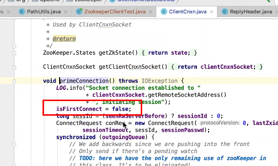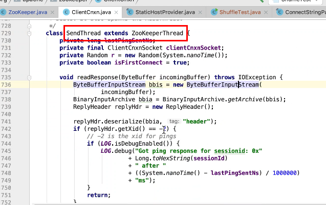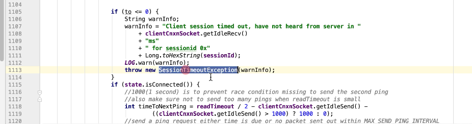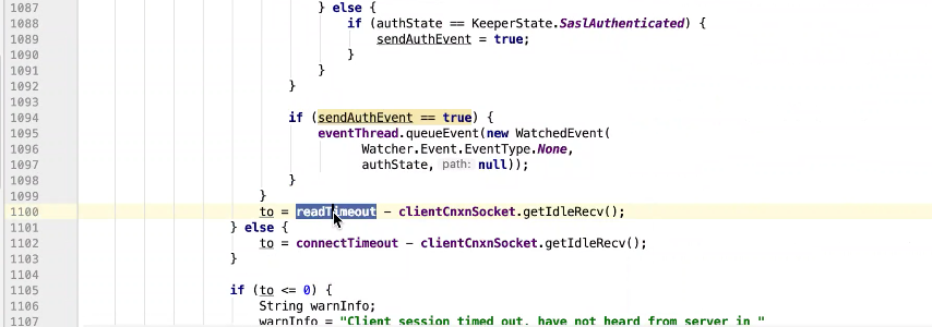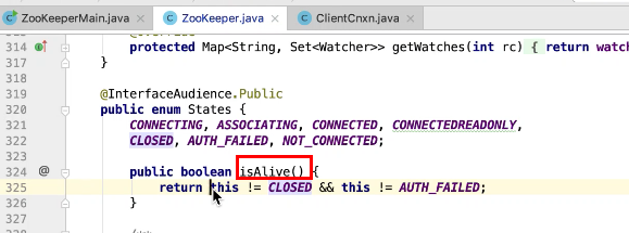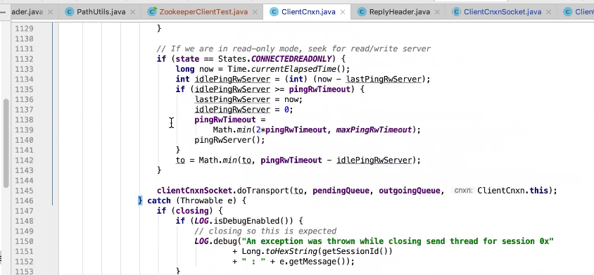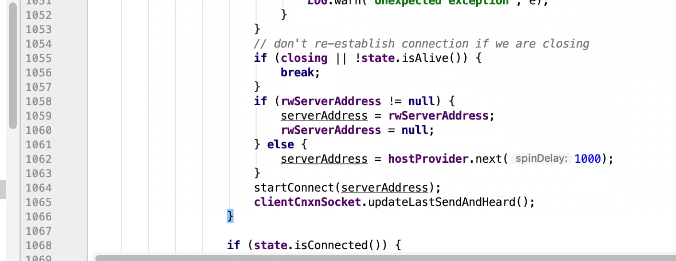 图17 为SendThread 的run()方法。图17 图18 1044行 默认状态为未连接状态。如果不是关闭状态和验证失败状态就是活着的状态图19 ;1046行如果未连接,是第一次连接1047行的if判断. 会走1062行 ,从hostPovider选取一个地址,进行socket连接。 1100行为读取超时= 设置的超时时间 减去 当前时间距离上次读取时间(now -上次读取时间)<0 则认为是超时,或者,设置的连接事件 减去当前时间距离上次发送时间(now -上次发送时间)小于0认为连接超时则抛出异常sessionTimeOutException。然后try catch捕获异常,程序不会中止,继续执行while循环,1044行;当第一次connect()方法时 图17-1,图17-2,图17-3 方法 把isFirstConnect置为false,当抛出sessionTimeOutException 异常时,进入1047行到1053行睡眠一段时间。1062行 ,图17-4 默认超时情况下从新从其他的地址中选取一个地址,不会是上一次执行的地址,因为会采用取余数的方式,图17-4;图1115行连接成功,就返送ping.图17-5 ,和发送逻辑一致,只不过类型为OpCode.ping ;xid=-2. ; 1115行连接成功 后1145行 客户端发送数据