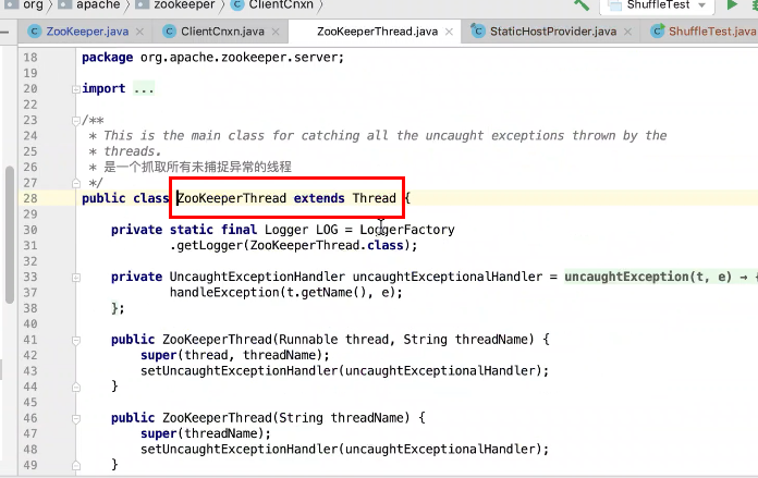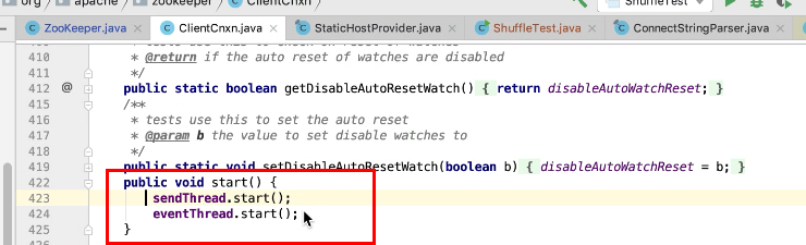 图14,图15,图16 启动两个线程,SendThread 继承ZookeeperThread 这个线程。Zookeerper线程继承Thread线程。