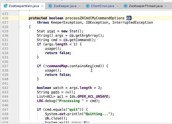 图33 689行创建命令 如果有-e,-s 为创建临时有序节点,如果 -e 就是临时节点,-s就是持久节点顺序 704行返回权限列表图34 ,707行调用zk 创建节点。709行打印命令 。649行推出命令调用了zk.close()方法图 36