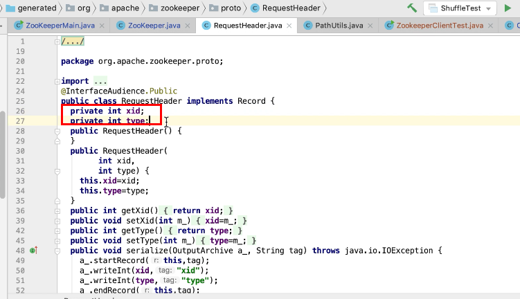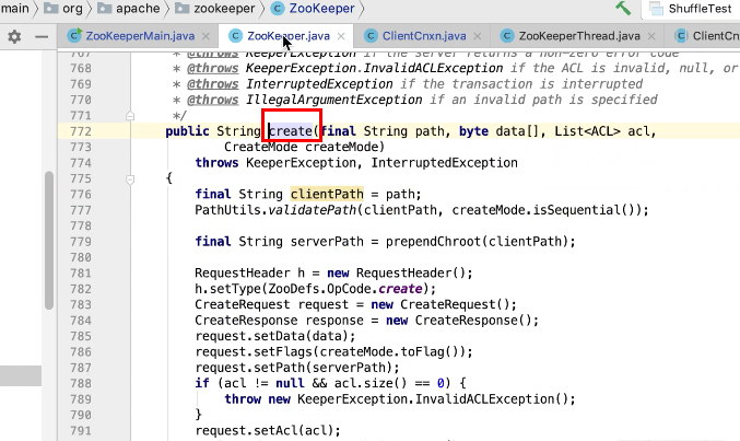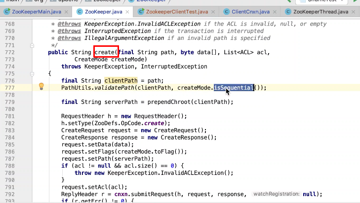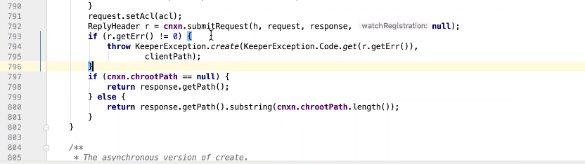 图37 777行验证path ,传一个是否顺序节点标志。如果是顺序节点会在path上固定加上+1图38 ;779行创建一个根目录图40;781行构建一个请求头图41,设置一个类型为create 图42 ,构建一个createRequest , createResponse请求, 设置内容,标记,path, 权限,792行 submitRequest 图43,通过socket 发送请求到服务端,获取相应头,判断相应头是否有错误信息,有抛出异常,如果没有,拿到path返回。
