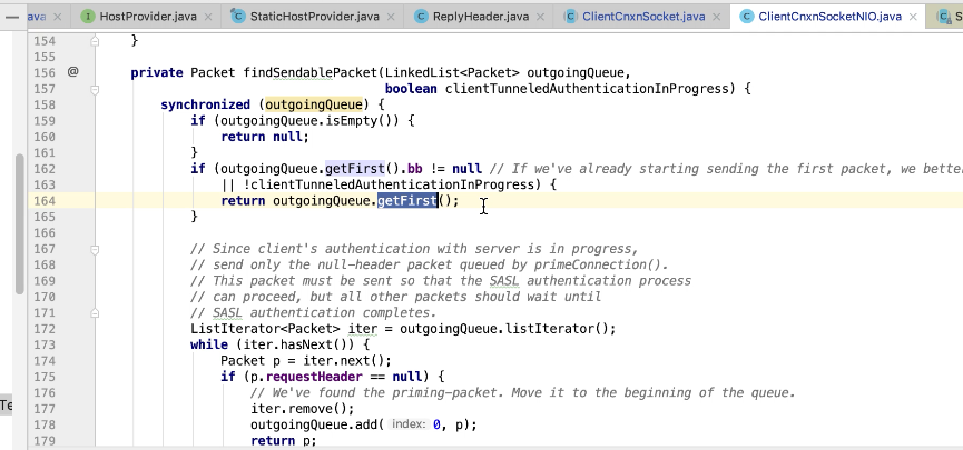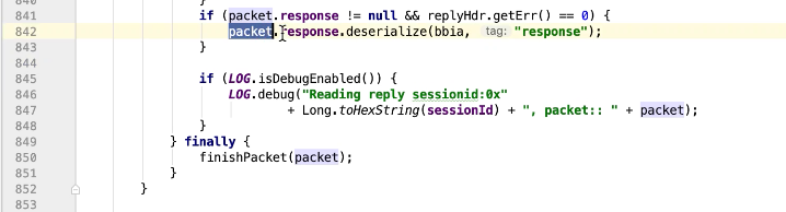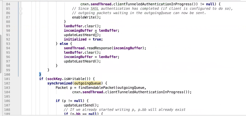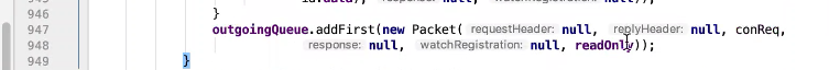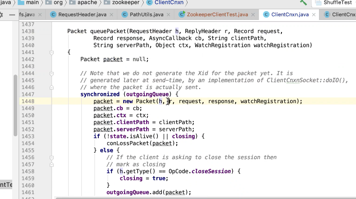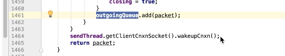图43 1407行 发送 queuePacket 一直阻塞等待直到 完成,才会唤醒,ReplyHeader有值才会返回。