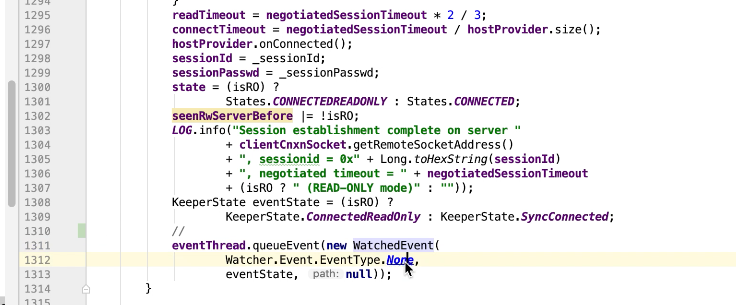 图17-13 1312行如果连接成功 本地注册一个Watcher的None事件。