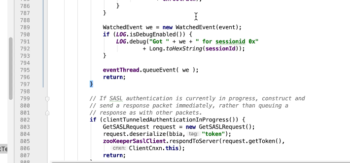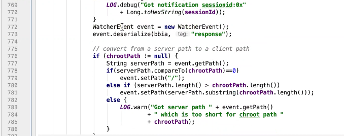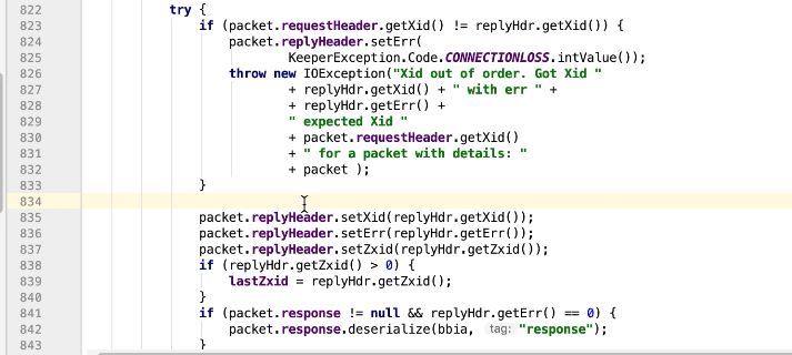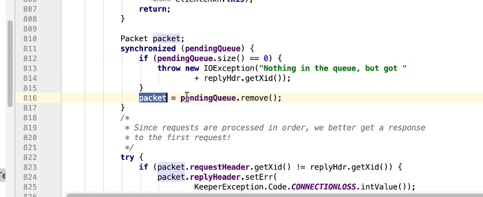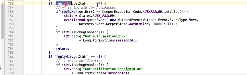 图17-15 通过判断xid的值来分别处理,-2 ping的处理,-4验证,-1 客户端接收服务的的事件。 823行 packet的replyHeader的xid和replyHdr的xid一致时,把replyHdr的请求头信息从新封装到packet中,842行中,如果服务端返回信息,同样把新增加的服务端返回信息封装到 packet中. replyHdr是什么呢,是把从参数传入的流信息进行解析转换为replyHdr,此时这个replyHdr没有response信息。850行完成通知图17-16