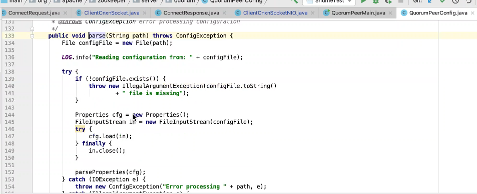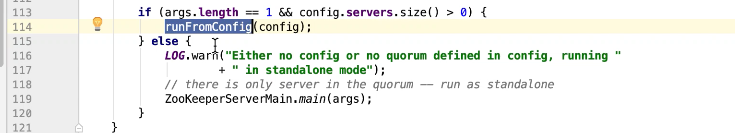 图5 104 行把传过来的参数解 析为QuorumPeerConfig对象,并为这个对象的属性赋值,图6;113判断 servers是不是大于0,是则是集群模式,反之为单机模式。