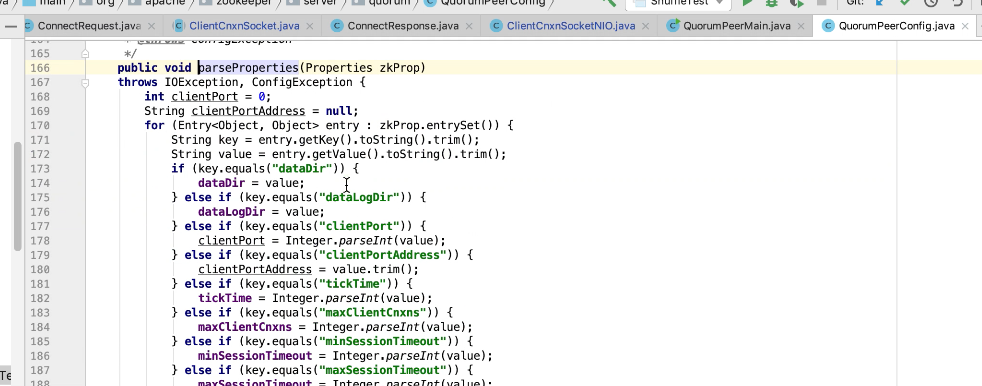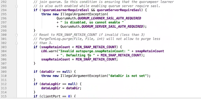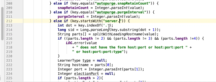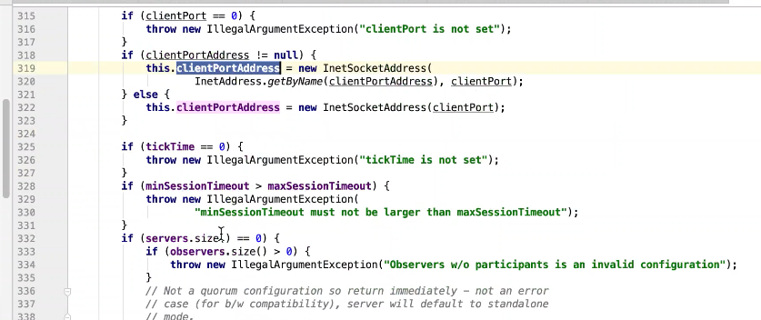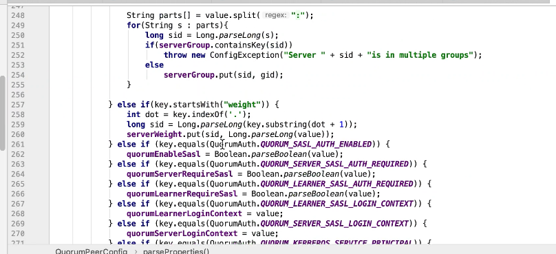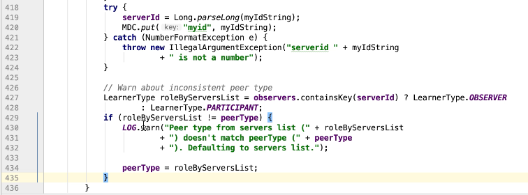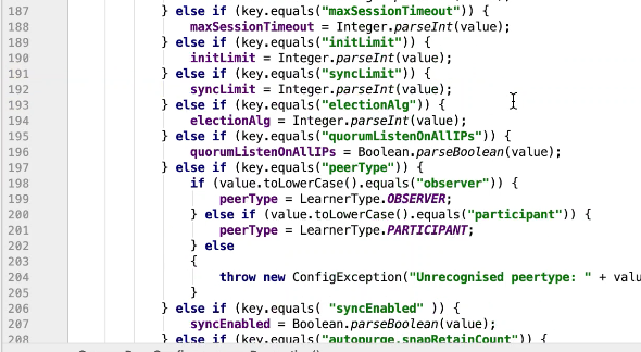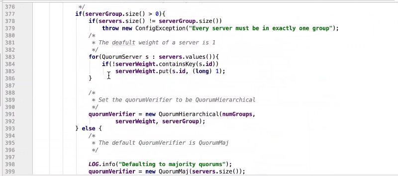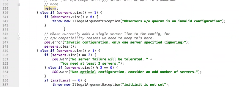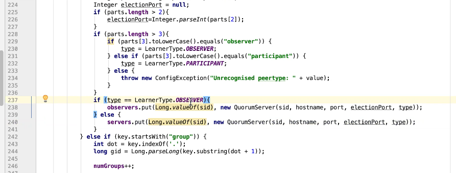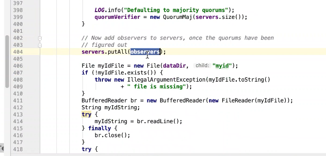 图9 229行 判断如果是observer ,设置一个observer标记,如果有这个标记则放在observers属性中其他放在servers 中。其他都是赋值操作。399行有一个过半校验的逻辑图10 ,可以发现过半校验并没有observer。