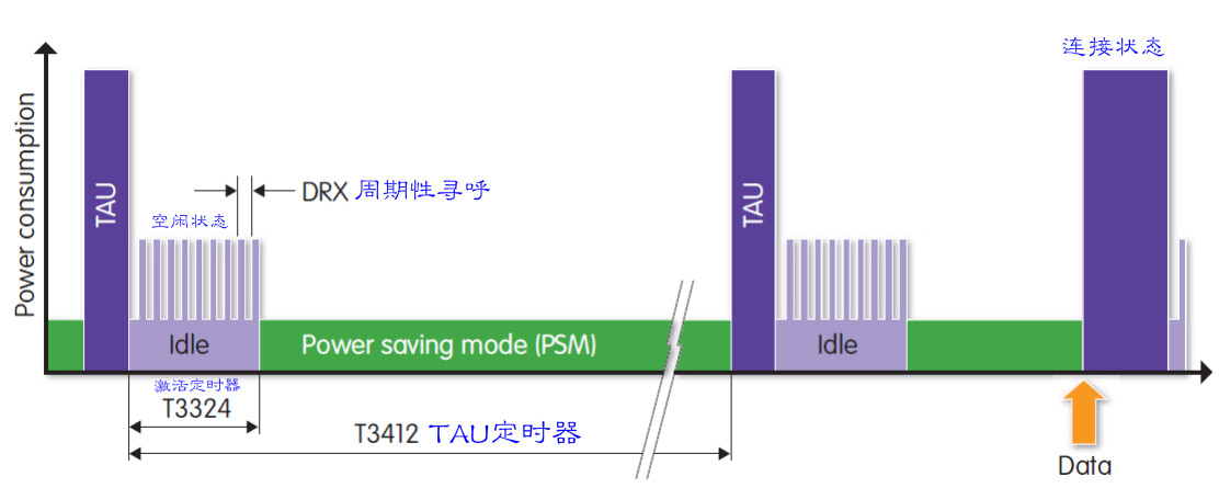 在下图中,T3412就是TAU定时器,T3324就是激活定时器。DRX就是周期性寻呼的时间,在空闲状态下,还支持周期性寻呼。在周期性寻呼之间,功耗是多少?