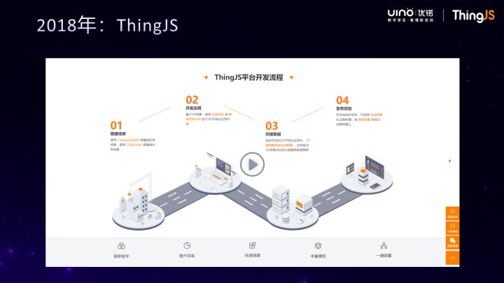 ➤ 2018 年:ThingJS正式发版,并在云栖大会上将ThingJS引擎OEM给阿里的IoT平台,同时,我们也通过三年时间验证了利用平台来做3D可视化应用开发的基本模式。