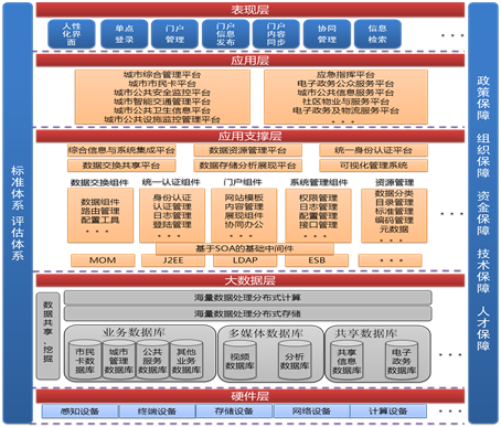 应用支撑层包括J2EE、ESB等给予SOA的基础中间件,数据交换、统一认证、门户、系统管理、资源管理等组件,综合信息与系统集成平台、数据资源管理平台、统一身份认证平台、数据交换共享平台、数据存储分析展现平台、可视化管理系统等。