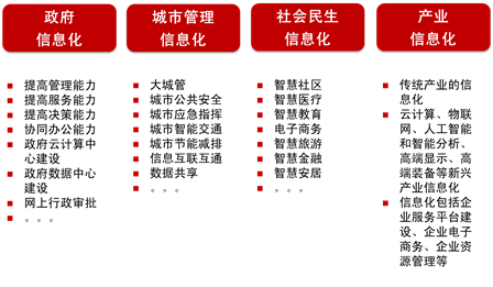 政府信息化包括加强政府云计算数据资源中心、协同办公平台、电子政务平台、网上行政审批等方面的建设;城市管理信息化包括城市大城管、城市应急指挥、城市公共安全、城市智能交通、城市基础设施等方面的建设;社会民生信息化是通过物联化、互联化、智能化实现城市一卡通、智慧教育、智慧文化、智慧旅游、智慧金融、电子商务、智慧安监、智慧社区等智慧服务;产业经济的信息化主要通过信息化的手段加强企业服务平台、企业资源管理平台、企业流程再造、企业安全管理等方面的建设,将企业的生产过程、物料移动、事物处理、现金流动、客户交互等业务过程数字化,使企业资源合理配置,以使企业能适应瞬息万变的市场经济竞争环境,求得最大的经济效益。