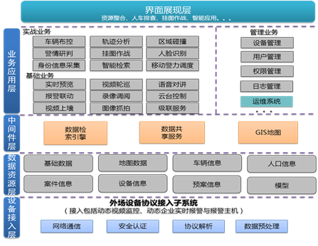 应用层包含公共安全、生产管理、园区通、环境监测、报警服务、应急预案、道路交通应用、智能安居应用、GIS服务、停车管理应用等。