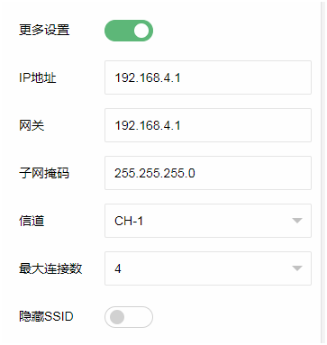 打开“更多设置”可以设置热点的IP地址,网关地址,子网掩码,信道,最大连接数