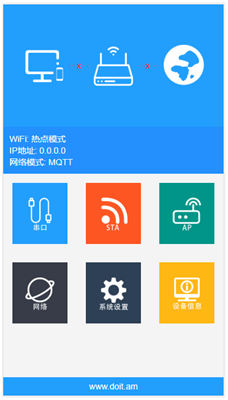 在配置模式下,设备工作在热点模式,指示灯快速闪烁。发出WiFi信号,信号名称为:“Doit_MQTT_XXXXXX”,其中“xxxxxx”是该设备的产品ID。产品ID是设备的唯一标识。
