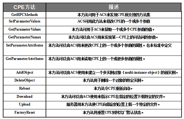 CPE函数由ACS调用,用来对CPE进行管理如:设置CPE参数、获取CPE参数、硬件升级、重启设备等;