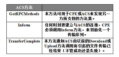 ACS函数由CPE调用,用来向ACS上报状态信息,请求硬件镜像文件下载(用来升级硬件)等等。ACS与CPE之间通过TR069协议特有的RPC方法进行互操作。