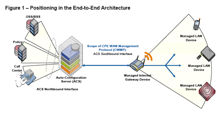 。ACS与CPE之间的接口称为南向接口,ACS与运营商的其他网管系统、业务管理系统、计费系统(OSS/BSS)之间的
