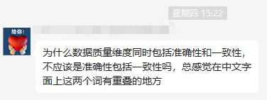 1、有位读者问道:“为什么数据质量维度同时包括准确性和一致性,不应该是准确性包括一致性吗,总感觉在中文字面上这两个词有重叠的地方”