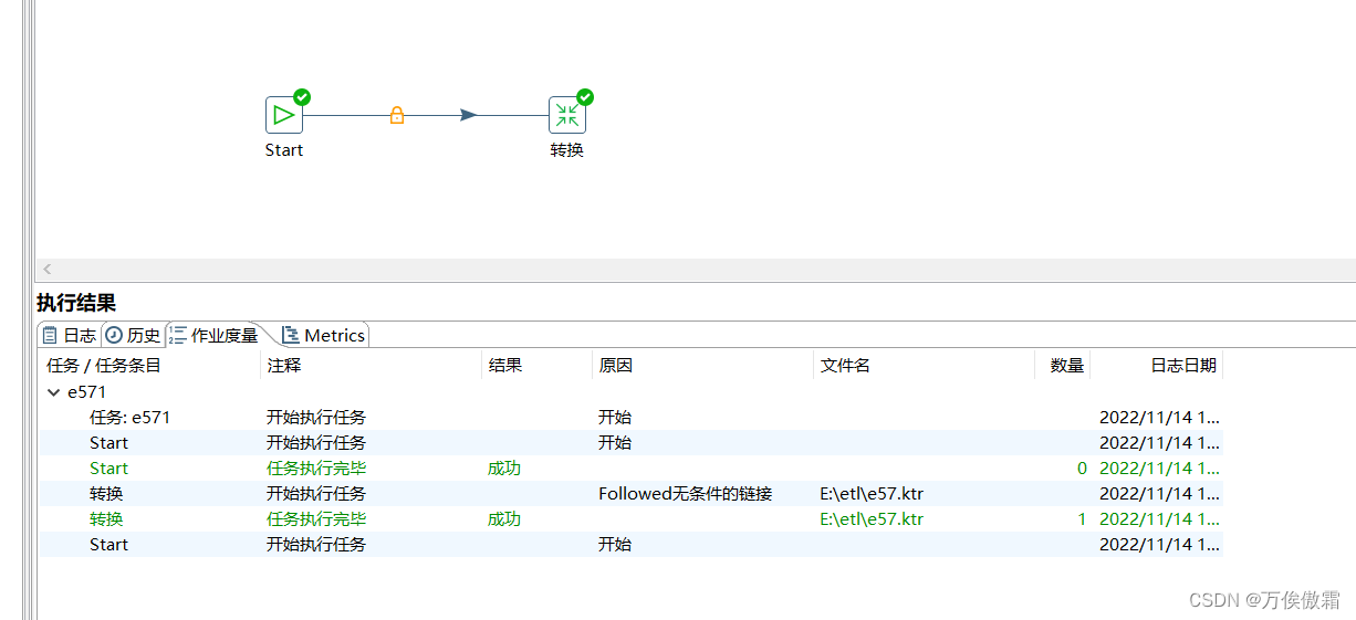 分析:由于转换e57.ktr的运行是单次的,若后续需要将原始数据进行转换,插入操作,则需要运行该转换,这样工作效率很低,因此通过kettle工具创建一个作业,对转换e57.ktr设置定时器,使得转换程序定时自动执行同步的操作。