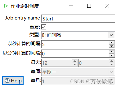 勾选重复复选框,类型为时间间隔,下面以秒计算的间隔设为5,以分钟计算的间隔设为0。这里意思为每五秒进行一次该作业。
