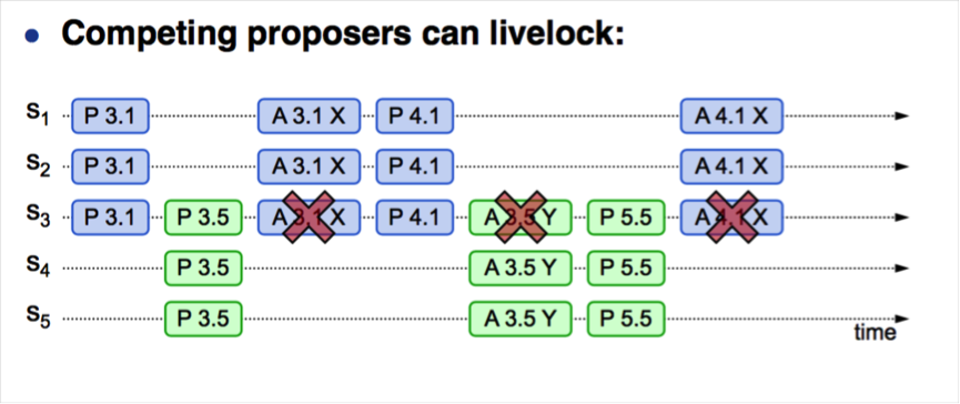 从上述流程可知,并发情况下,可能会出现第4步或者第7步频繁重试的情况,导致性能低下,更严重者可能导致永远都无法达成一致的情况,就是所谓的“活锁”,如下图所示: