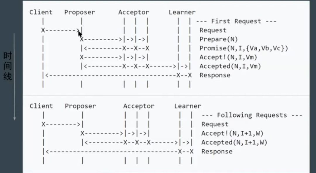 还记得上文中我们提到过,同步编号是非常重要的问题,绿色框出来的实际上就是同步编号的过程。通过这个编号,就知道每条操作日志的先后顺序。简单说来,第一阶段,获取编号,第二阶段,写入日志。可以看出来,Paxos 通过两轮交互,牺牲时间和性能来达到弥补一致性的问题。