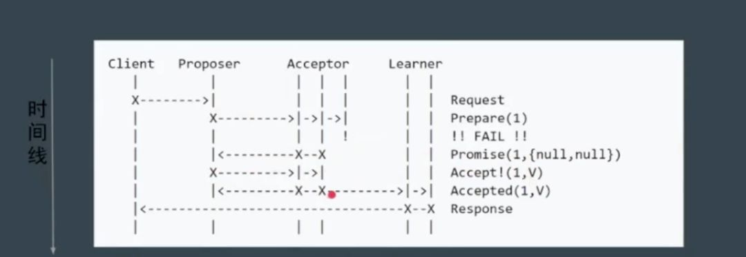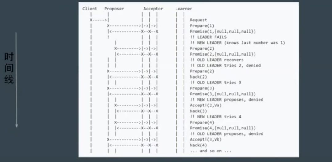 Paxos 存在活锁问题。如图,当 第一个 proposer 在第一阶段发出请求,还没来得及后续的第二阶段请求,紧接着第二个 proposer 在第一阶段也发出请求,如果这样无穷无尽,acceptor 始终停留在决定顺序号的过程上,那大家谁也成功不了,遇到这样的问题,其实很好解决,如果发现顺序号被新的 proposer 更新了,则引入一个随机的等待的超时时间,这样就避免了多个 proposer 发生冲突的问题。