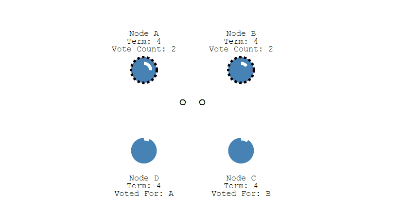 ① 如果有多个 Follower 成为 Candidate,并且所获得票数相同,那么就需要重新开始投票,例如下图中 Candidate B 和 Candidate D 都获得两票,因此需要重新开始投票。