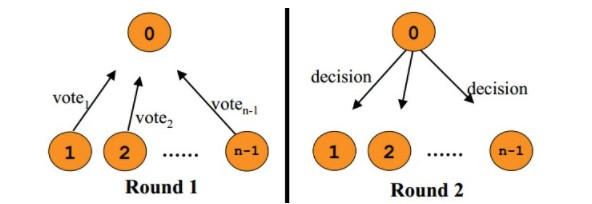 两类节点:协调者(Coordinator)和参与者(Participants),协调者只有一个,参与者可以有多个。