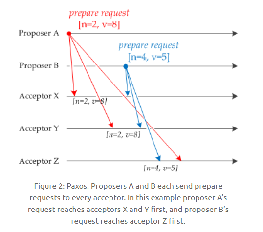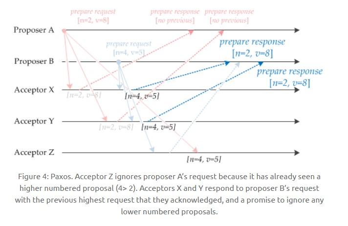 如下图,Acceptor Z 收到 Proposer A 发来的 [n=2, v=8] 的提议请求,由于之前已经接收过 [n=4, v=5] 的提议,并且 n > 2,因此就抛弃该提议请求;Acceptor X 收到 Proposer B 发来的 [n=4, v=5] 的提议请求,因为之前接收到的提议为 [n=2, v=8],并且 2 <= 4,因此就发送 [n=2, v=8] 的提议响应,设置当前接收到的提议为 [n=4, v=5],并且保证以后不会再接受序号小于 4 的提议。Acceptor Y 类似。