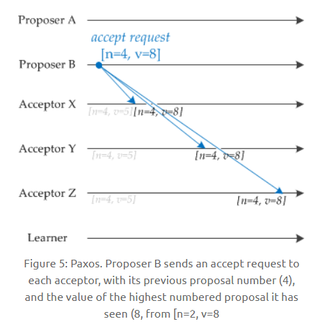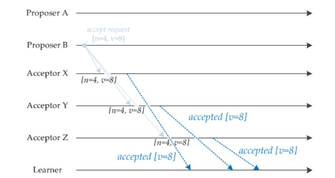 Proposer B 过后也收到了两个提议响应,因此也开始发送接受请求。需要注意的是,接受请求的 v 需要取它收到的最大 v 值,也就是 8。因此它发送 [n=4, v=8] 的接受请求。