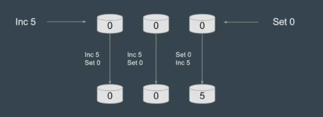 在并发环境下,因为每个节点的操作日志写入顺序无法保证一致,也就无法保证最终的一致性。如图,都是向三个节点