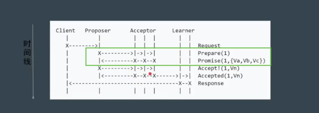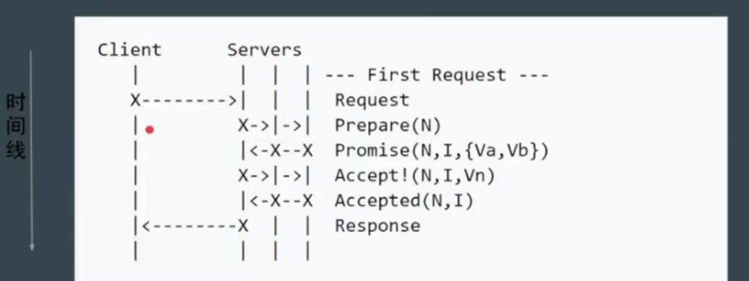 还记得上文中我们提到过,同步编号是非常重要的问题,绿色框出来的实际上就是同步编号的过程。通过这个编号,就知道每条操作日志的先后顺序。简单说来,第一阶段,获取编号,第二阶段,写入日志。可以看出来,Paxos 通过两轮交互,牺牲时间和性能来达到弥补一致性的问题。