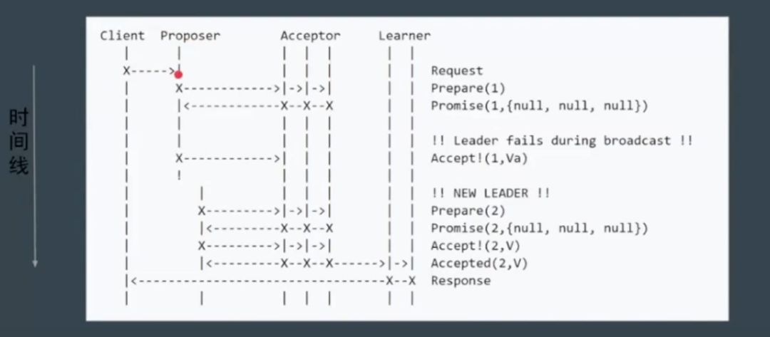 Paxos 存在活锁问题。如图,当 第一个 proposer 在第一阶段发出请求,还没来得及后续的第二阶段请求,紧接着第二个 proposer 在第一阶段也发出请求,如果这样无穷无尽,acceptor 始终停留在决定顺序号的过程上,那大家谁也成功不了,遇到这样的问题,其实很好解决,如果发现顺序号被新的 proposer 更新了,则引入一个随机的等待的超时时间,这样就避免了多个 proposer 发生冲突的问题。
