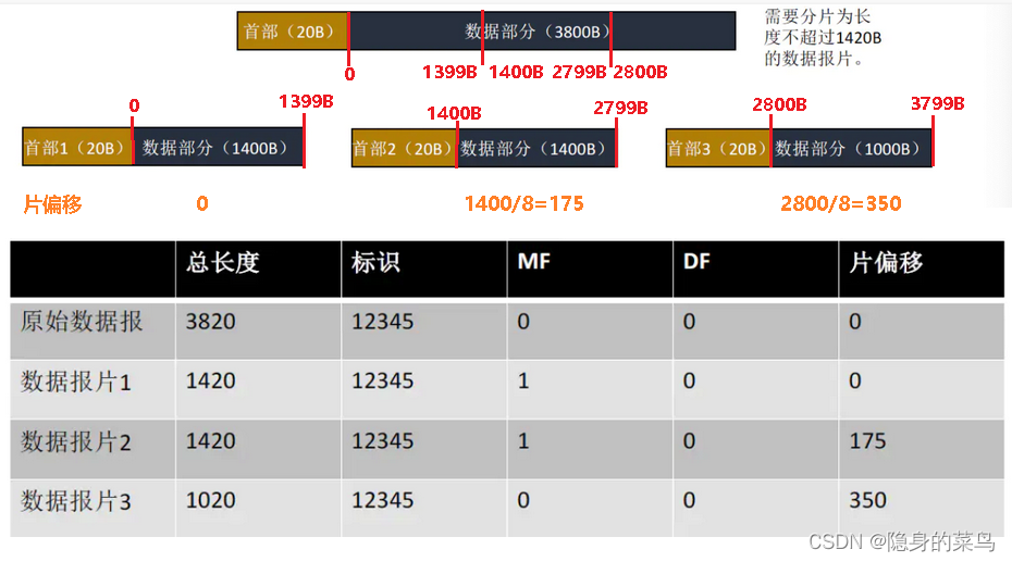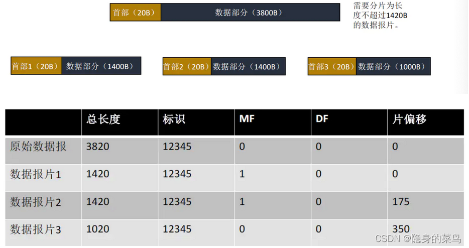 片偏移:指出较长分组分片后,某片在原分组中的相对位置。以8B为单位。除了最后一个分片,每个分片长度一定是8B的整数倍。(帮助还原数据报)
