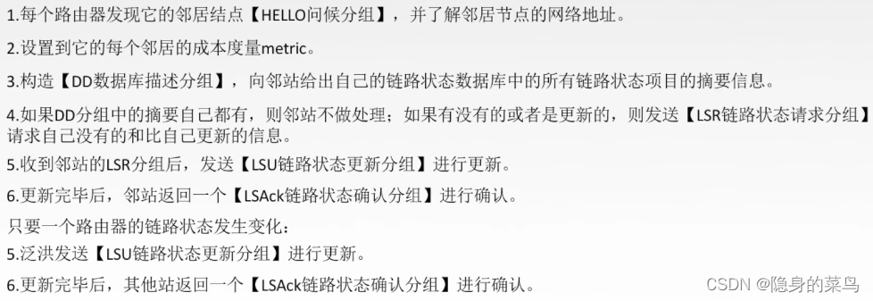 2.发送的信息就是与本路由器相邻的所有路由器的链路状态(本路由器和哪些路由器相邻,以及该链路的度量/代价——费用、距离、时延、带宽等)。